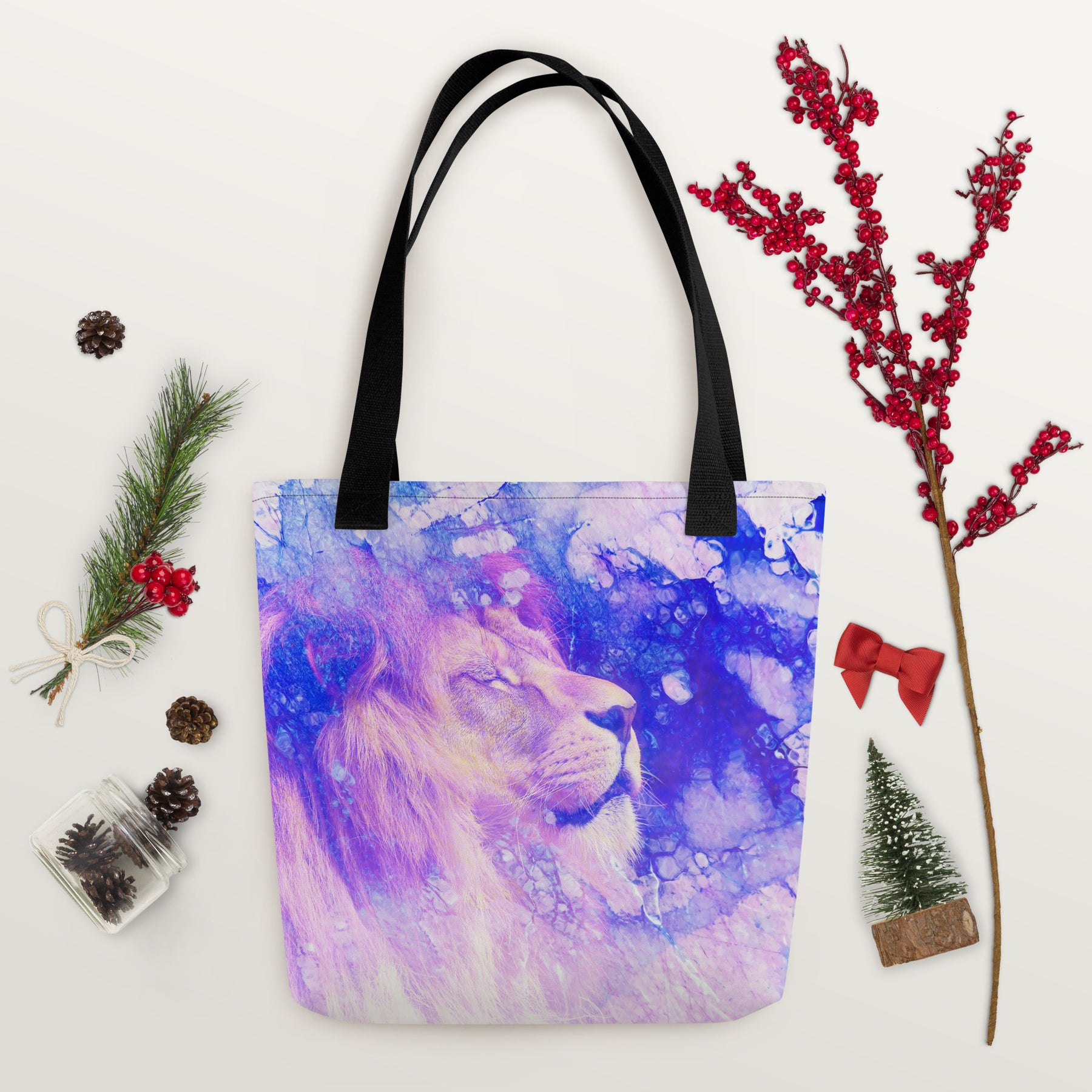 This powerful lion profile design is rendered in beautiful watercolor tones, symbolizing strength and faith. Featuring a vivid lion’s face, this design is perfect for tote bags. A meaningful addition to your wardrobe or home decor.