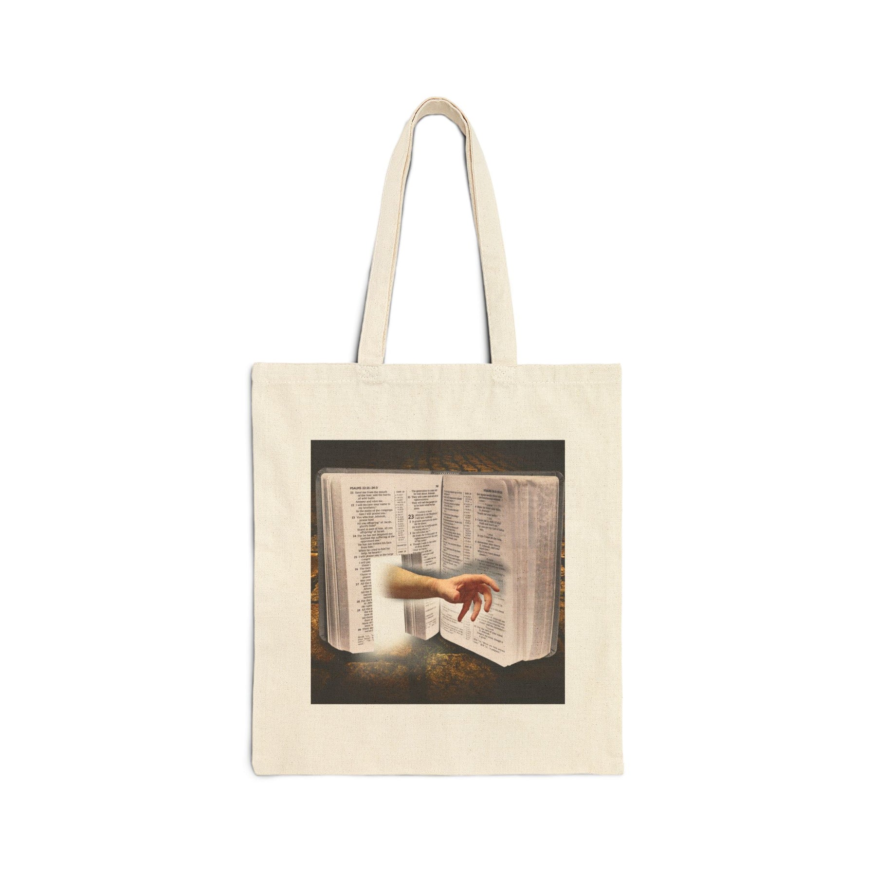 This dramatic and surreal tote bag design features an open Bible on a glowing cobblestone path, with a human arm reaching outward as if breaking through the pages. The bright light behind the arm gives a powerful feel, blending faith, symbolism, and fantasy. Perfect for those looking for a unique statement piece that reflects their spiritual beliefs and love for literature. Ideal for religious holidays, church events, book lovers, and spiritual individuals.